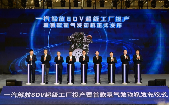 李乐成、熊茂平、陈绍旺、邱现东、吴碧磊等领导共同启动AGGAME解放首款氢气发动机CA6HV3发布仪式。陈绍旺、吴碧磊分别致辞。